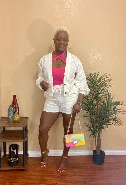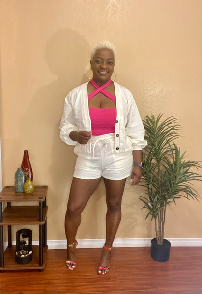 FRENCH TERRY BUTTON DOWN CARDIGAN & DRAWSTRING WAIST SHORTS SET - 100% COTTON FRENCH TERRY - RAGLAN SLEEVES CARDIGAN WITH POCKETS - DRAWSTRING ELASTIC WAIST SHORTS WITH POCKETS