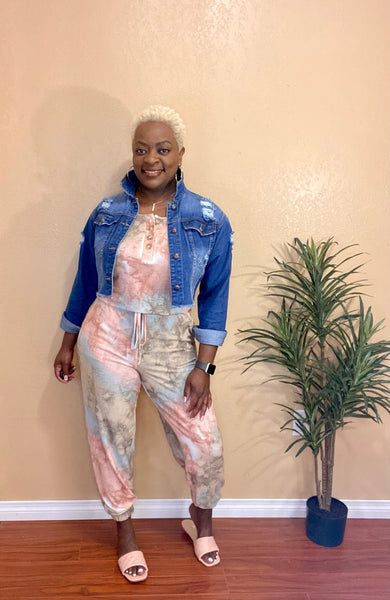 A woven denim jacket featuring a basic collar, distressed design, dropped shoulders, long sleeves with buttoned cuffs, front button closures, chest flap pockets, a cropped length, and a frayed hem.